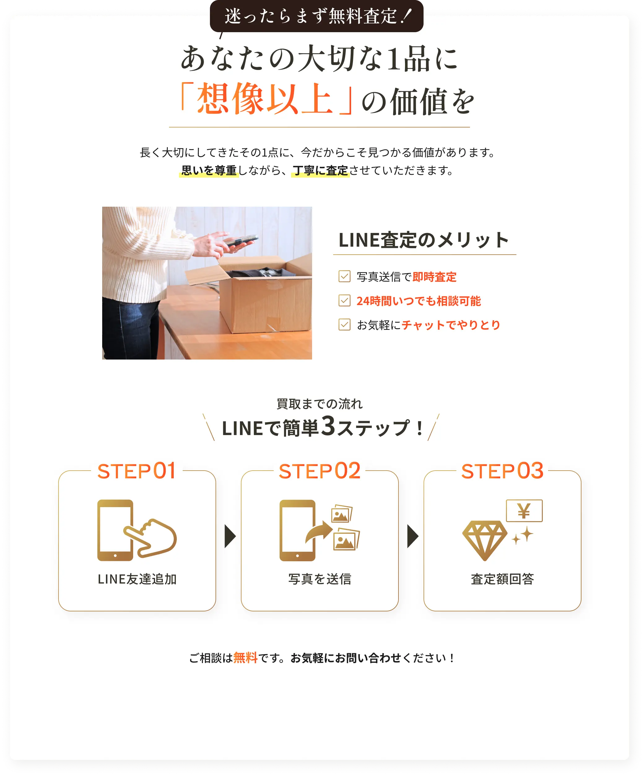 Q.査定だけお願いして売らなくても大丈夫ですか?A.もちろん大丈夫です。査定だけでもお気軽にご利用ください。