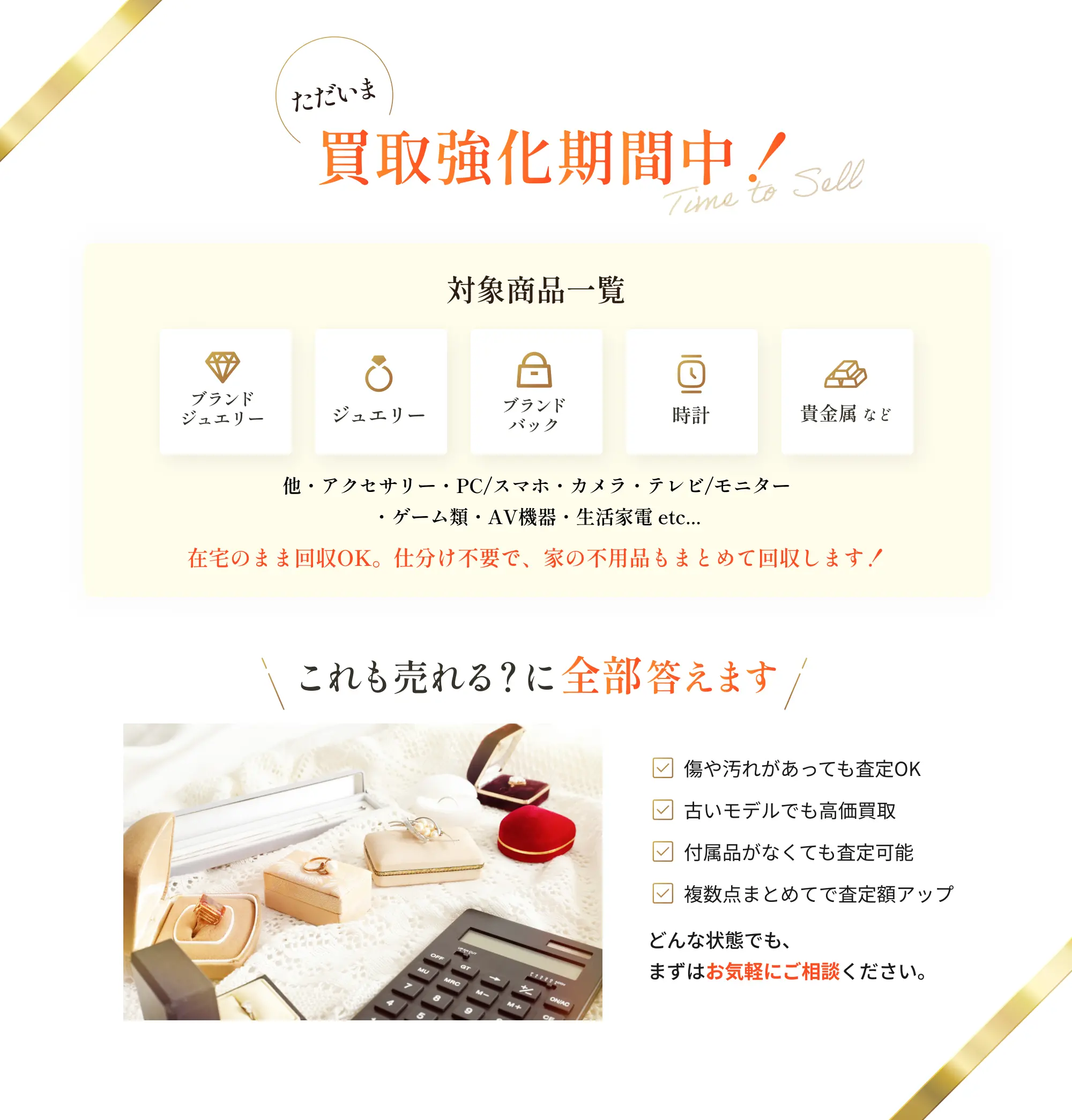 Q.どんなものが査定対象ですか?A.ブランド品、ジュエリー、貴金属、時計、遺品整理品など幅広く対応しております。詳しくはお問い合わせください。