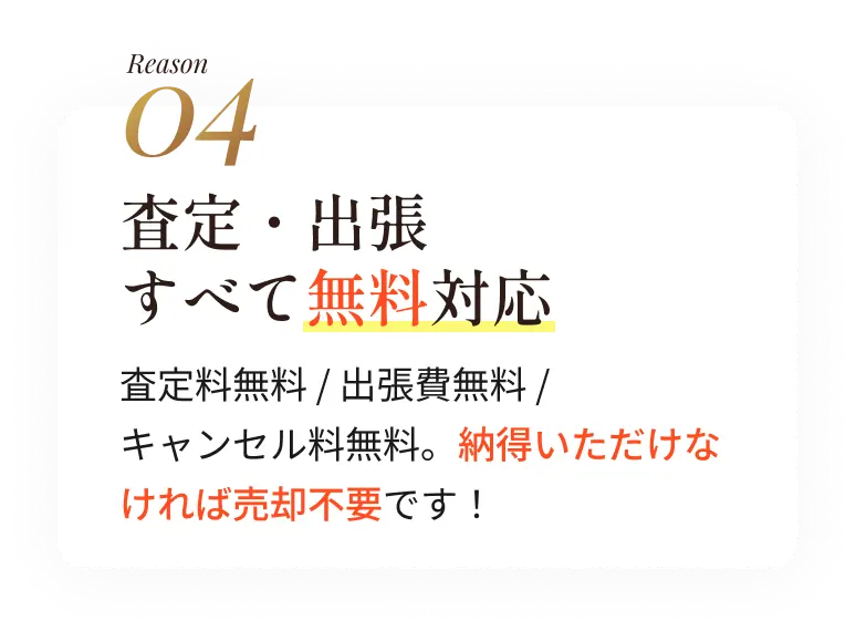 Q.査定にお金はかかりますか?A.査定料・出張料は一切いただいておりません。お気軽にご予約ください。